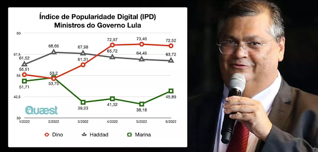 A Quaest Pesquisa e Consultoria publicou nesta segunda-feira (12) uma nova rodada do Índice de Popularidade Digital dos ministros do governo Lula. O ministro da Justiça, Flávio Dino, aparece na liderança, com 72,52 pontos. Em seguida aparece o ministro da Fazenda, Fernando Haddad, com 63,72 pontos, e a ministra do Meio Ambiente, Marina Silva, com 45,89 pontos.